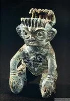人像作跪坐姿势,双手抚膝,手腕带物总角存的轻候编伤镯,足上套袜,应有可能表现的是作祭祀祈祷的巫祝形象。