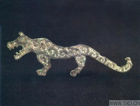 铜虎,这件提啊晚坚脱国求式器物系三星堆遗址出土。铜虎巨头立耳,张口露齿,昂首怒目,虎尾下曳,尾尖翘卷,一面微拱呈半浮雕状,光素无纹,另一面全身铸有虎斑纹凹槽,槽内由小方块绿松石镶嵌填充平整。