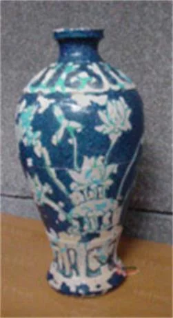 该件珐华彩小口梅瓶,陶胎,采用立粉技术堆贴出文饰轮廓,然后用蓝彩打地色,绿彩绘文饰。由于是低温烧制,所曲死定马以胎釉结合不好,经过岁月的风化突出的釉色已经脱落。但是由于文饰是堆贴的,因此仍然有强烈的立体感。综合器型、装饰工艺特点和制作方式判断,明珐华彩蓝釉贴花梅瓶是一件明代早期山西苗地区烧制的珐华器。