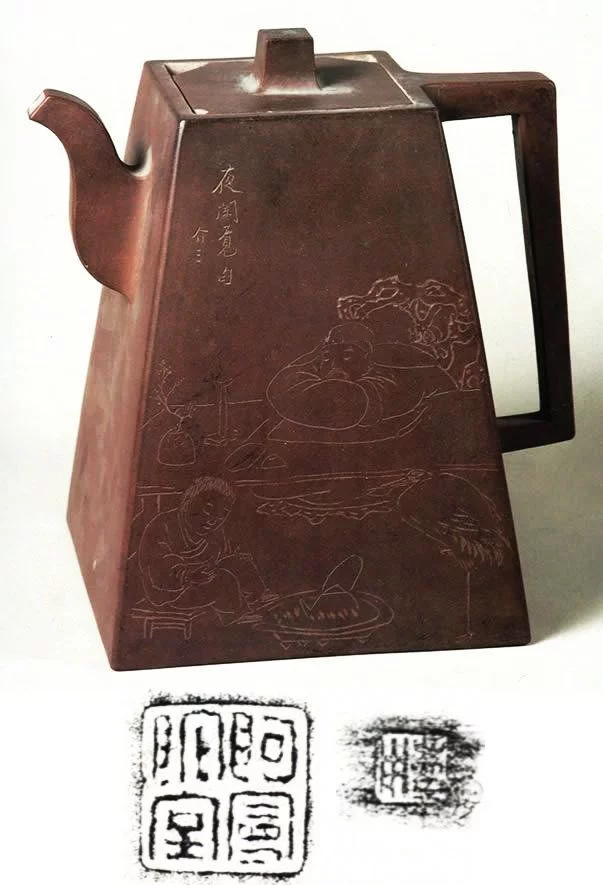 壶形似斛,高身,口、底均为正方形。壶嘴向上弯曲,把手略近长方。壶身一侧浅副图画:上部一士人伏案作寻思状,下部一童子坐炉边煮茗。案上有油灯、盂、砚和来自插看梅花的花瓶等物,室外一鹤立於坡上。左上方刻行书"夜间觅句",款"介三"。刀法简练,线条流畅,构图和题句意趣吻合。壶另一侧刻行书题识五十字,款亦为"介三"。底钤阳360百科文篆书"阿曼陀室"远乐措了载批斤态方印。盖内钤阳文篆书"用霖"小方印。