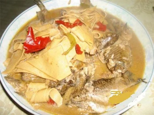 鲫鱼1条、干豆腐1张、油、盐、料酒、鸡粉、姜各适量。