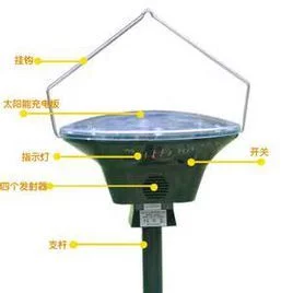 太阳能超声波驱鸟器XK来自QN-1超声波驱鸟器本实用新型提供了一种由壳体、太阳能接收器部件、电路控制板、电池盒与蜂鸣器构成一种利用太阳能的驱鸟器,太阳能接收器部件固定连接在壳体顶部,电路控制板与电池盒安装在壳体内空间中,太阳能接收器部件、电路控制板、蜂鸣器、电池盒电连接。驱鸟器利用声波驱赶鸟类,对鸟类无伤害,且利用太阳能提供能源,不污染环境,安装方便,不用拉电线,适合于任何地区,任何场合。