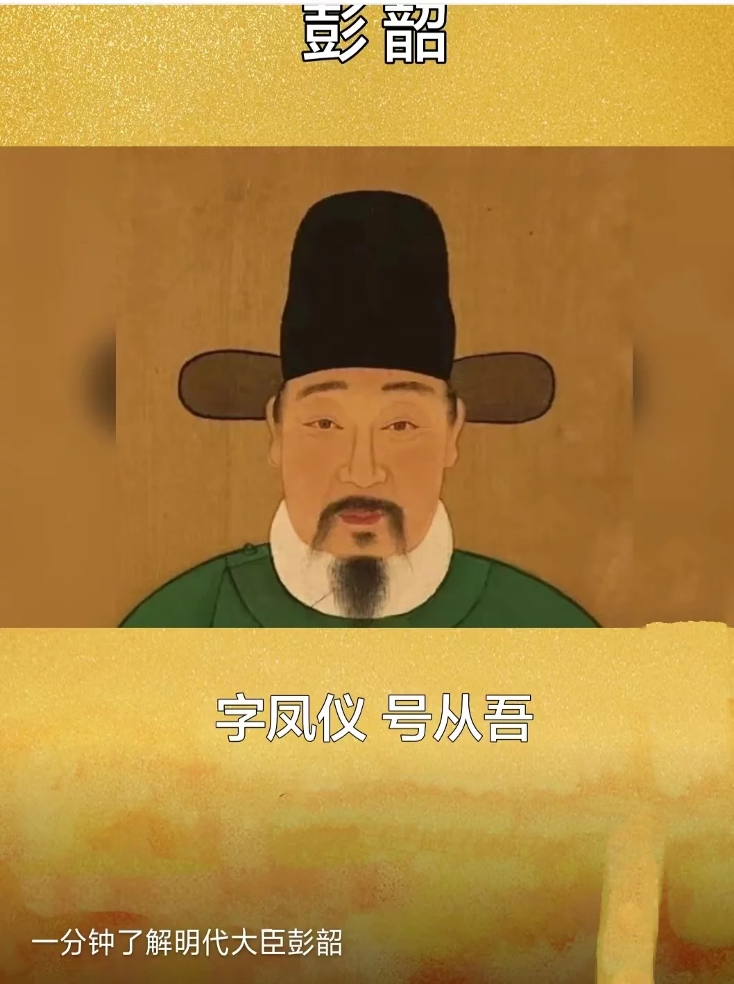 明代大臣彭韶,字凤仪,莆田人。天顺元年来自进士。授刑部主事,进员外郎。成化二年疏论佥都御史张岐憸邪,宜召王竑、李秉、叶盛,忤旨,下诏狱。给事中毛弘等救之,不听,卒输赎。寻迁郎中。逝世后赠太子少保。