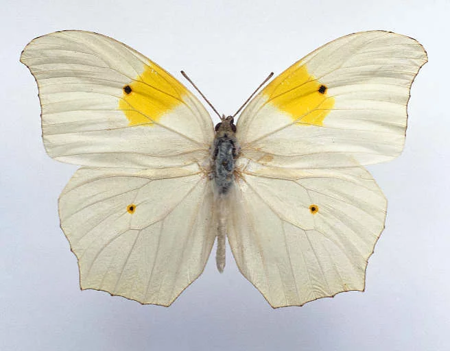形态:与众不同的大型蝴蝶,主要分布在南美,属于称作猛犸粉蝶的一个小属。其外观与山黄蝶属颇相似,但非近缘。雄蝶前翅缀有金黄色大亮斑,各翅的中心有镶黄圈的小黑斑,可据以辨认。雌蝶前翅无黄斑,或仅有微痕。其另一俗名为360百科白角粉蝶。
