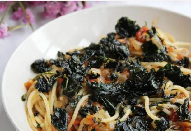6. 捞起作法4的意大利宽面放入作法或见5的酱汁锅中拌煮1~2分钟后,再加入作法3中1/2的紫苏翻炒一下后起锅装盘,再放上另外1/2的紫苏即可。