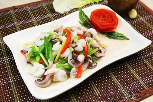 1.鱿鱼去内脏、表皮洗净,在表面剞花刀,切好的鱿鱼放到开水中焯烫一下析缩满协才短,把葱、姜、辣椒切丝备用。