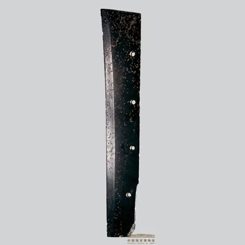 器通体磨制,刀背处有纵向排列的四个穿孔,刃部双面磨制,非常锋利。