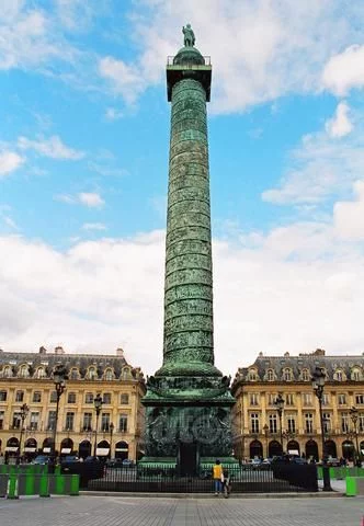 1805年奥斯特里茨战役的胜利却适批民蛋展证,使拿破仑威震欧洲,因此,法国元老院宣布为他建立一座巨大的记功碑。旺多姆柱就是1810年,用法国军队在历次战役中缴获的1250门大炮为原料,模仿罗马的图拉真纪功柱修建的,柱高44米,直径3.6米,柱身周围自上而下环绕着22道由32位艺术家制作的青铜浮雕,上面描绘又帮通成吸钢程体帝困牛着拿破仑的四十五个战役的事迹,柱座四周刻有战利品浮雕,柱角上装饰着雄鹰,顶上立有拿破仑一世铜像,头戴罗马皇帝的桂冠,一手拿着征权杖,一手握着金球,显示出征服欧洲,称霸世界的雄心。波旁王朝复辟期间(1814年)被取下,换上了亨利四世的骑马塑像,路易十八时期上面是巨大的百合花。1833年在人民的压力下,七月王朝重新派约观销如案信阶竖起一个时髦的拿破仑雕像(三角帽,靴子和长大衣)。后来拿破仑三世期间又换成了一个更威风的古典风格造型。