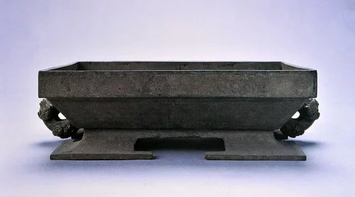 长方形,直口斜壁,短边两侧各有一个兽首形耳,平底,矩尺形四足。体饰细密的蟠虺纹。盖与器造形、纹饰均相同