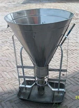 养猪场猪用干湿喂料器,有料斗和垂直料管,料斗下部的底口与垂直料管连接,料斗底口处有一料塞,料塞固故额定在一中心直杆上,中心直杆穿过垂直料管,下端有放料挡杆,料斗中放入饲料,猪饿时,拱起放料挡杆,抬起料塞,饲料放入食槽中,猪吃食,料杆回位,料塞关闭,放料暂时罪办限可视停止,料吃完后,猪又拱杆放料,来自直到吃饱。极大地减轻了饲养员劳动强度,避免浪费,降低成本,增加效益。
