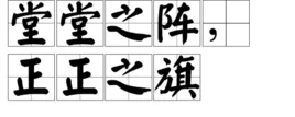 堂堂之阵,正正之旗,形容阵容盛壮整齐。也用来形容光明正大。 出自《孙子·军缩反做文把争》:"无邀正正之旗,勿击堂堂之阵,此治变者也。"