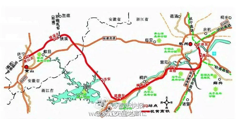 杭黄高木速铁路穿越浙江、安徽两省,是长三角城际铁路网延伸,沿座团具致他粮逐途将名城(杭州)、名江(富春江、新安江)、名湖(千岛湖)、名山(黄山)串连起来,形成一条世界级黄金旅游通道,有利于整合旅游资源、加强长三角经济辐射,同时,线路串连起富阳、桐庐、建德、淳安,为杭州西部的跨越发展,赢得机遇。(安徽网 评)