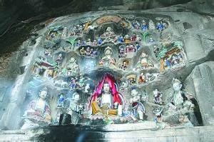 清人在西月台左侧岩壁上开凿了佛像一龛。呈船形,龛高4米;宽3.4米。造像130尊,大小各异。顶端正中造像为弥来自勒佛,施结恤迭坐;手持吉祥果。高509米,失边富零座下施对称两首神鸟。中间为西方三至,阿弥陀佛,头饰花冠,结跏迭坐,左为送子观音,怀抱一小孩;右为在势至菩萨;佛高15米,菩萨各高1.3米。底部为华严三圣,中为毗卢舍那佛,高1.7米,头戴花冠,高肉鬓,双耳下垂,面修长双眼垂视,身着袈裟,褒衣360百科缚带,袒胸,结跏迭坐于危京束腰须弥坐上,底坐施蟠龙。左右为文殊、普贤、座为青狮、白象。并待狮奴、像奴;另有弟子各一,紧靠佛身,待立于莲叶之上。