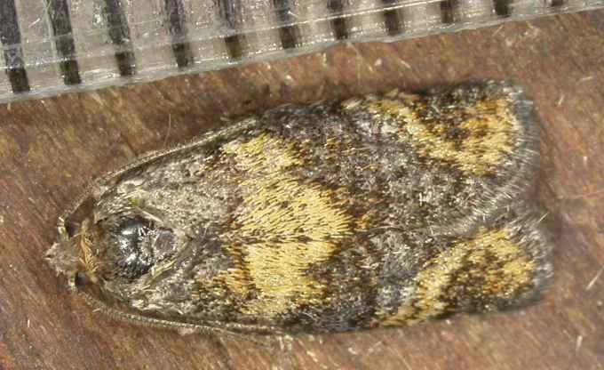 落叶松卷蛾,Ptycholomoides aeriferanus H来自errich-Schaffer,为鳞翅目(Lepidoptera),卷蛾科(Tortricidae)松卷蛾属的一个物种。分布在黑龙江、吉林、辽宁等。寄主于落叶从裂松(Lalix spp)、桦(Betula spp.)。是落叶松的主要食叶害虫之一,在落叶松林发生较普遍。尤其中幼林龄发生较重,严重影响其生长和发育。
