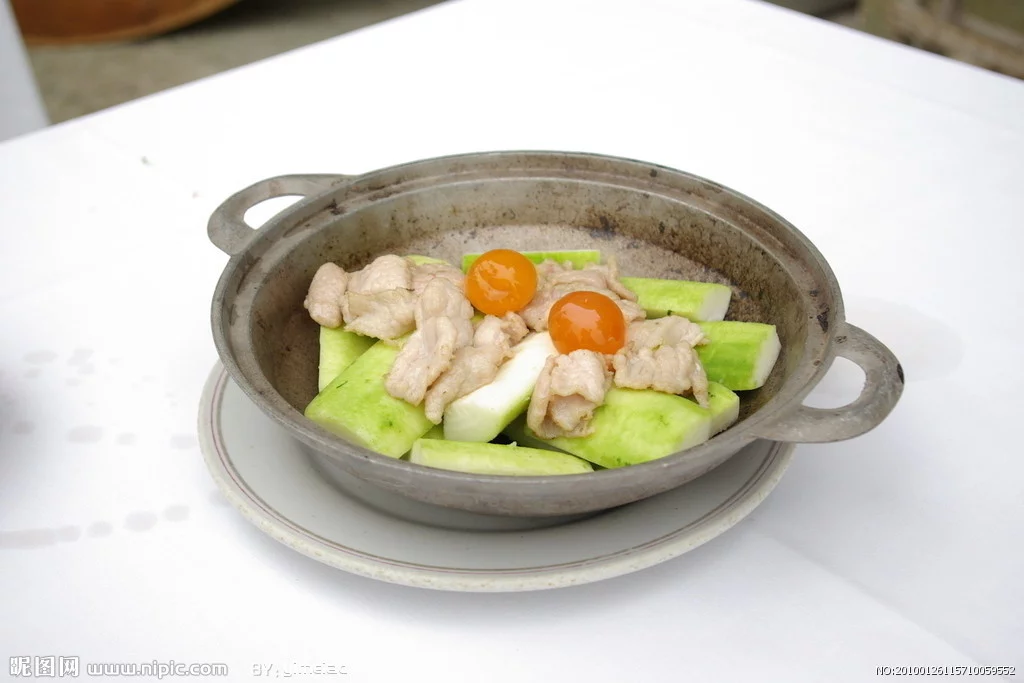 3、开锅下油,爆香蒜头和姜片,下节瓜翻炒片刻,然后下适量鸡汤和淡菜,以盐、糖调味,慢火焖至节瓜软稔,下支竹和烧肉,慢火收汁,最后调味便成。