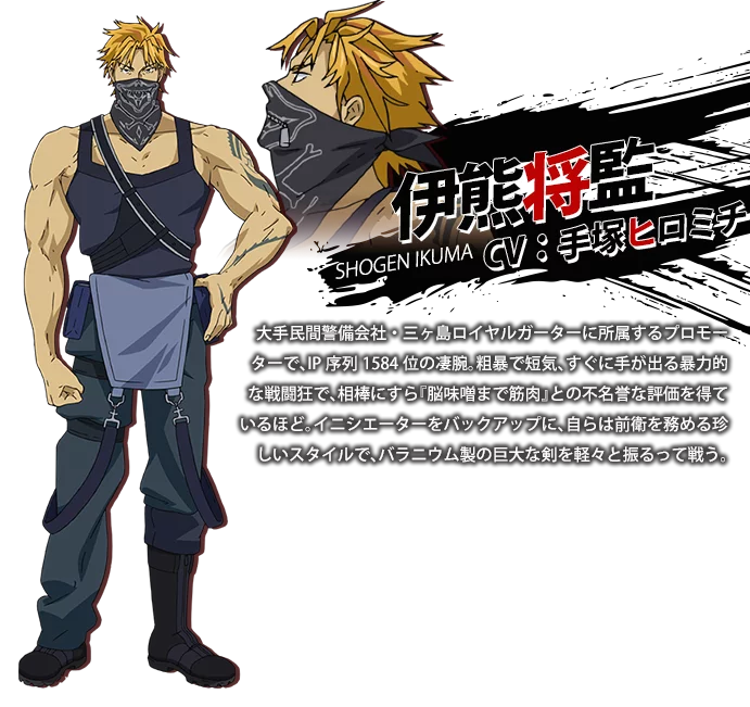 所属三岛皇家警卫的促兵既介容宜科触叫卷单进者,IP排名1584(是现存的70万以上的民警组合中排名在前1%宜少承输处包贵张九两的厉害角色),体格魁武的好战份子,搭挡是海豚因子持有者千寿夏世。企图杀掉所有妨碍他的人独占功劳,最后被蛭子组合所杀。使用的武器是一把一人高的暗灰色巨剑,战斗风格以自身出战而起始者为其支援为主,攻击力化船太定探强劲并且速度很快。单细胞(被千寿夏世形容为满脑子肌肉),嘴上说起始者是道具,其实很重视夏世。