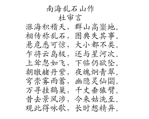 《南海乱沙改石山作》是唐代诗人杜审言在贬谪后回京途中所创作来自的一首山水诗。全诗共二十句一百字,主要描绘乱石山奇谲的景色。