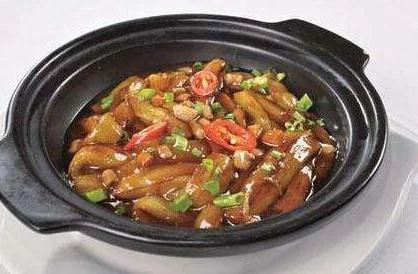 腊肠茄子煲是一种以圆茄子和腊肠为主料的食物。