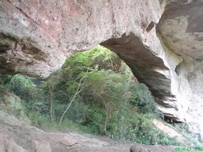 仙依神换烟今医油军互翻华人桥 过三望岗向东南,到一大峡谷,谷中突兀一座形象逼真的拱桥。桥形斜翘,东南低而西北高,似一道彩虹在峡谷间凌空升起。桥长200余米,形似鲤鱼背脊。桥拱洞呈半圆形,高约15米,跨度约30米。桥墩旁有一泓清泉,泉水清洌甘甜。如此天然拱桥,当地百姓称之为仙人桥。桥下方为一处能遮风挡雨的穿心岩洞,洞内可容上百人,古为避乱之所。桥面上端昔日砌有一道寨门,延伸处有泥垒城墙,现已坍塌。