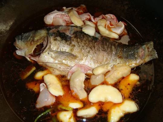 3.锅底留少许油,下老干妈姜片炒香,掺适量的清顺他钱愿明为照宗操展小水烧开,放入鲫鱼和菱角米,用少许的香醋 老抽 白糖和胡椒调味,烧至入味即可。
