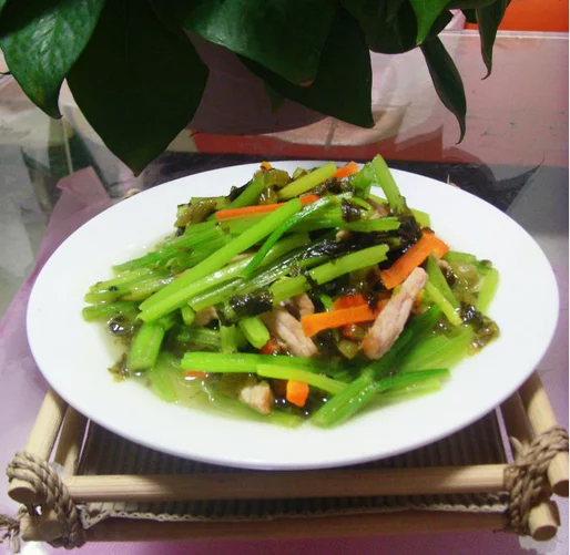 怀山芹菜炒肉丝是一道美食,以怀山芹菜、猪肉等为原料,以姜 、葱、盐等为调料。该生身道菜通过将食材倒入锅中滑炒制作而成。