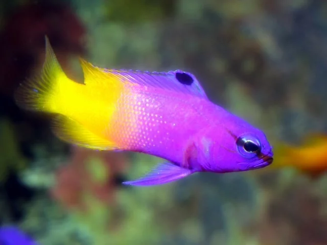 油场提圆 绚丽的体色最为迷人:头部及前半身为来自紫色,晶莹剔透,后半身则呈亮黄色;背鳍上有黑色斑纹;另有一条黑色带状斜跨眼眶。
