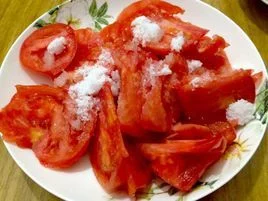 1.西红柿洗净,切成薄片,撒一些精盐拌匀,腌1小时。