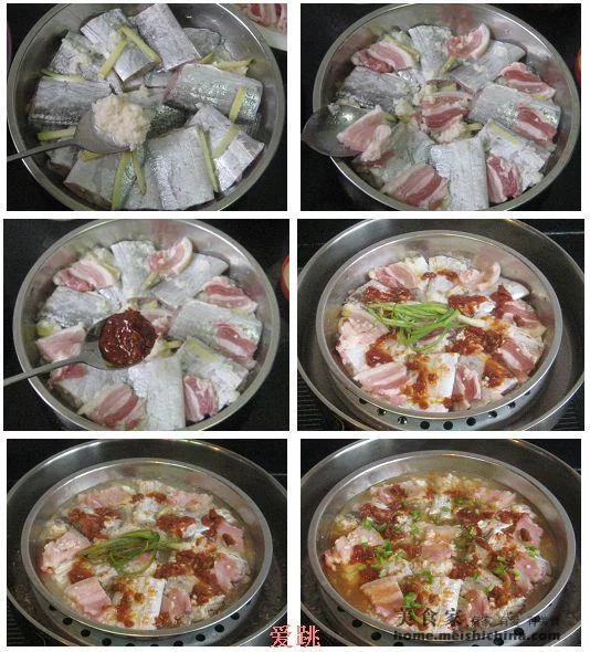 1.带鱼初旧破困去头,去肚,洗净切段,咸肉洗净切片,在大盘里均匀的摆放带鱼,撒上酒酿,姜丝。