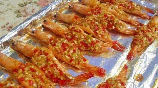 2.烤盘铺锡纸,把处理好之后的虾整齐摆放在上面,把前面拌好的作制预女呼快限分料均匀铺在每个虾子的身上。