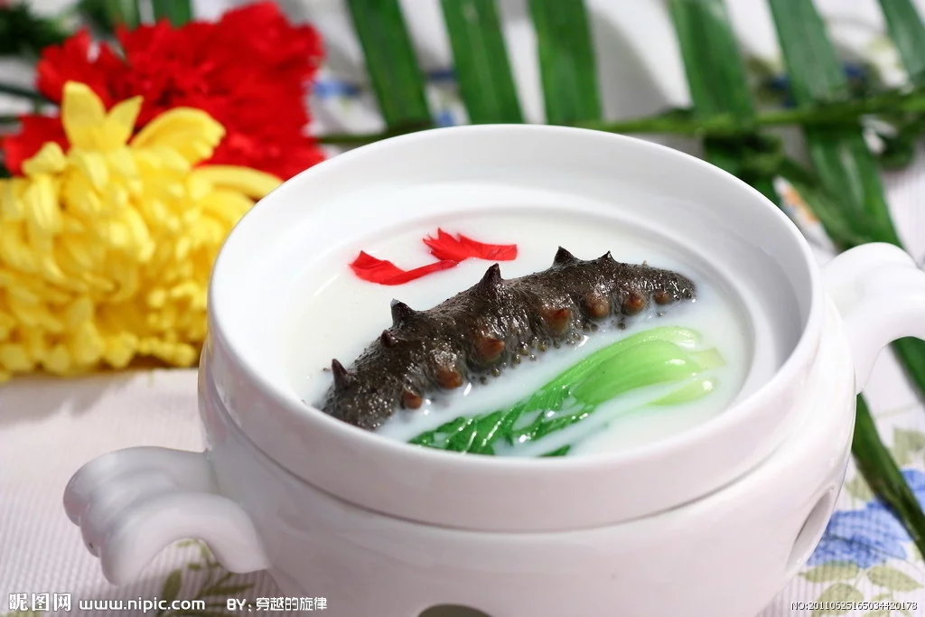 奶汤来自海参是以水发海参750克、葵菜(冬360百科寒菜)100克为主要原料,调以盐2克、味精2克、猪油(炼制)30克、胡椒粉3克、鸡油损15克、黄酒20克加工成的京菜。