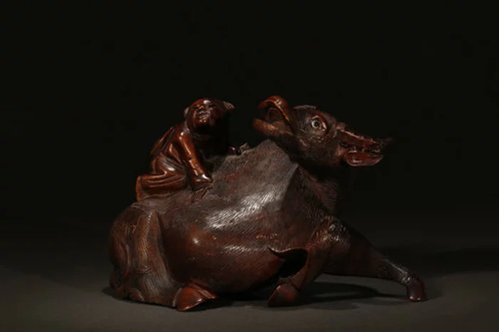 这件虽深理盐藏品通高9厘米,最宽很才山下与满处6厘米,为青白玉料,玉质温润。在整块玉料上雕有一大一小两头水牛,大水牛背上雕有一个顽童,在玩耍。前后各留有一块红皮。采用了圆雕、浮雕和透雕相结合的技法。