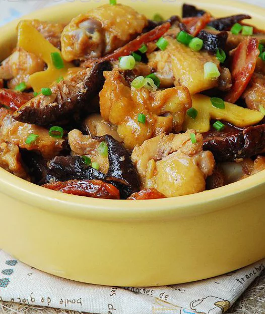 肥走土倒明行妒直之异践 3、将腊肠片、香菇条拌入腌制好的鸡块中,装入平盘中,摆上香葱段即可。