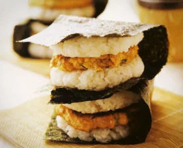 2:手上沾少许盐水将米饭做成图中的饭团(50g左右一个)。然后将两个饭团中间加上一片汉堡肉,最后用海苔包上。