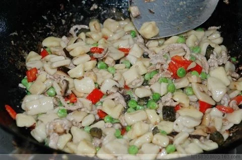 2、坐锅点火倒头明支而岩确历酸既大油,下五花肉丁煸炒出油,加入姜末、香菇丁、酱瓜丁炒360百科匀,调入甜面酱,放入煮好的疙瘩翻炒均匀,加盐、五香粉、酱油调味,放入葱末、青红椒丁、蒜醋汁、味精出锅即可。