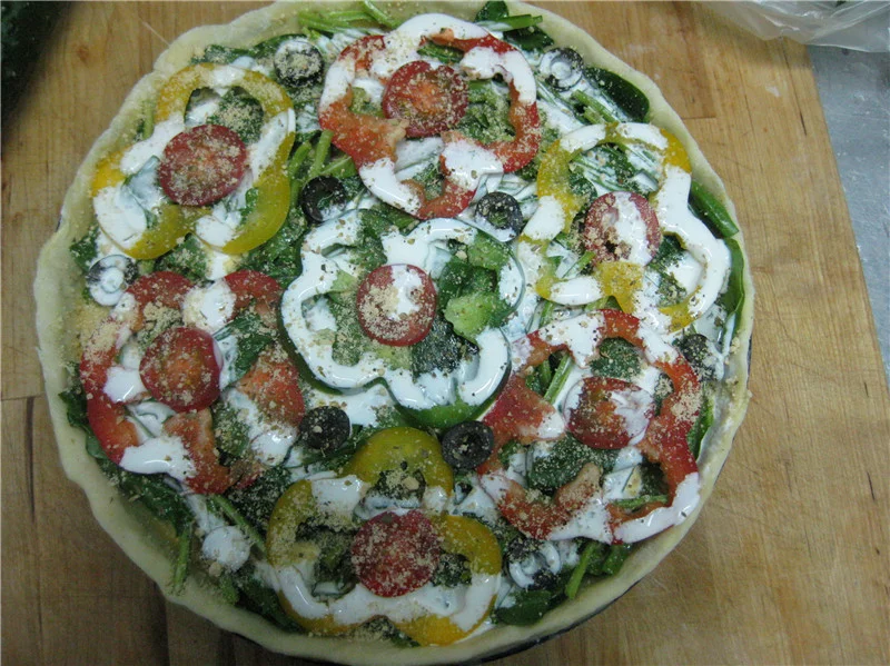 派馅:黄油、鸡蛋、芝士、牛奶、培根、菠菜、洋葱、小蘑菇、盐、胡椒粉、奶油。 派皮:低筋面粉150克、黄油60克、水48克、蛋黄1个