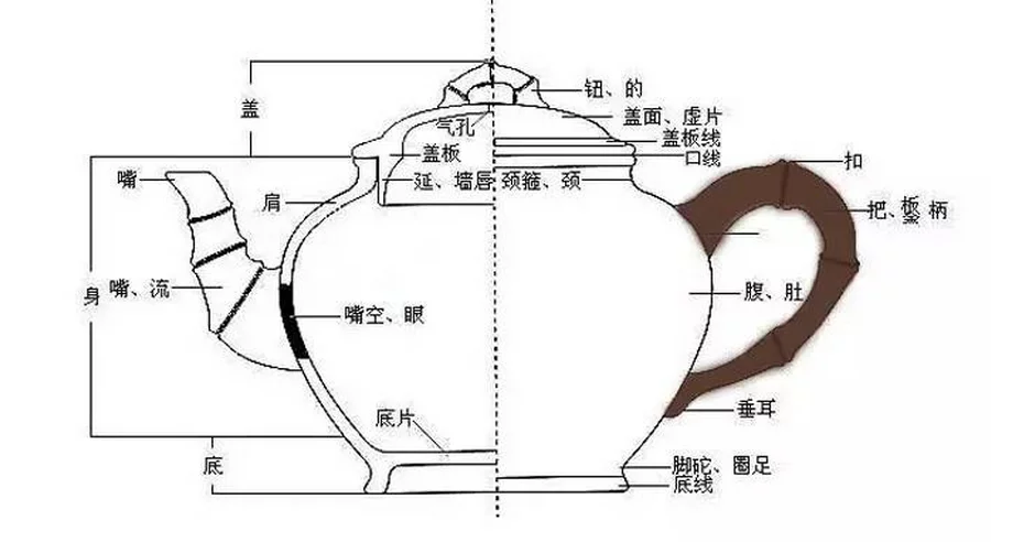 壶把是为便于握持而设置.源于古青铜器爵杯的弧形把.源于瓷执壶条形壶把的称"柄".壶把置于壶肩至壶腹下端,来自与壶嘴位置对称、均势.具体可分端把、横把、提梁三大类。