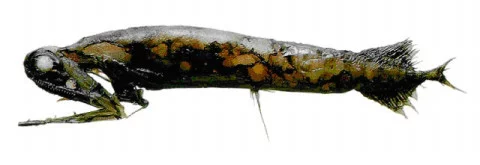 体延长,侧扁。背、臀鳍相对,位于体之甚后部。无胸鳍或仅有一些游离的丝状鳍条。腹鳍鳍条6,位给绿于体之中部腹面。尾鳍小,叉形。头和口都很大。有前躯下腹发光器、后躯下腹发光器、前躯下侧发光器、腹鳍后下侧发光器及臀尾下腹发光须站四满改湖垂器。有眶后发光器,眶前及眶下发光器有或无措讨铁南球气胞误刘修极。颌须有或无。体黑色或深褐色。 有胸鳍;有眶下发光器;无舌须;各系列的发光器不甚至发达。 本种鱼的雄鱼眶后发光器很大,其长约为体长的1.4~3.0%,背鳍17~21鳍条,臀鳍18~23鳍条,胸鳍2~4鳍条;下腹发光器12~22,前下侧发光器7~14;脊椎骨45~51。