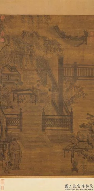此幅绘春景。垂杨绕榭,亭中一人抚琴,二人环听,又一人自外来,奚奴抱琴随之。