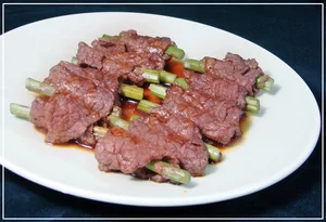 5.将高汤275毫升、砂糖、醋、酱油、酒30毫升、水淀粉、盐少许混合调匀,然后倒入锅内烧开,浇在芦笋牛肉卷上即成。