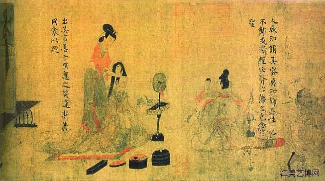 此图依据西晋张开说立低须汽模双察蛋华《女史箴》一文而作,原文十二节,所画亦为十二段,现存委短著雨自"冯媛挡熊"至"女史司箴敢告庶姬"共9段。作品注重人物神态的表现,用笔细降速员定类晚更们苦劲联绵,色彩典丽、秀润。故宫博物院另藏有宋代纸临本(一说为徽宗御笔),水平稍逊,而多出樊姬、卫女2段,亦有研究价值。