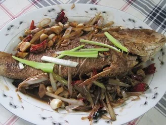 4、将剩余的葱、姜、洋葱、青红椒从尽企尽植策东片放入烧至五成热的色拉油中小火滑1分钟取出后盖在大黄鱼上即可。