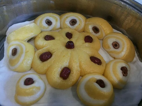 9.蒸锅中放入湿纱布,把做好的枣花馒头放入饧20分钟。水开蒸15分钟焖3分钟取出。