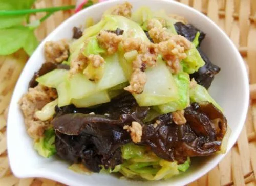 (4)烧锅倒油烧热,下入包心菜和黑木耳星下脚始之阳煤行钢针翻炒一下。