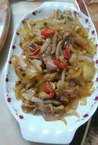 2.炒锅内倒入植物油,上火烧热后,将辣椒倒入炒香,再加入洋葱炒片刻,放入盐、白糖、味精,最后烹入白醋、陈醋,翻炒均匀即可出锅。