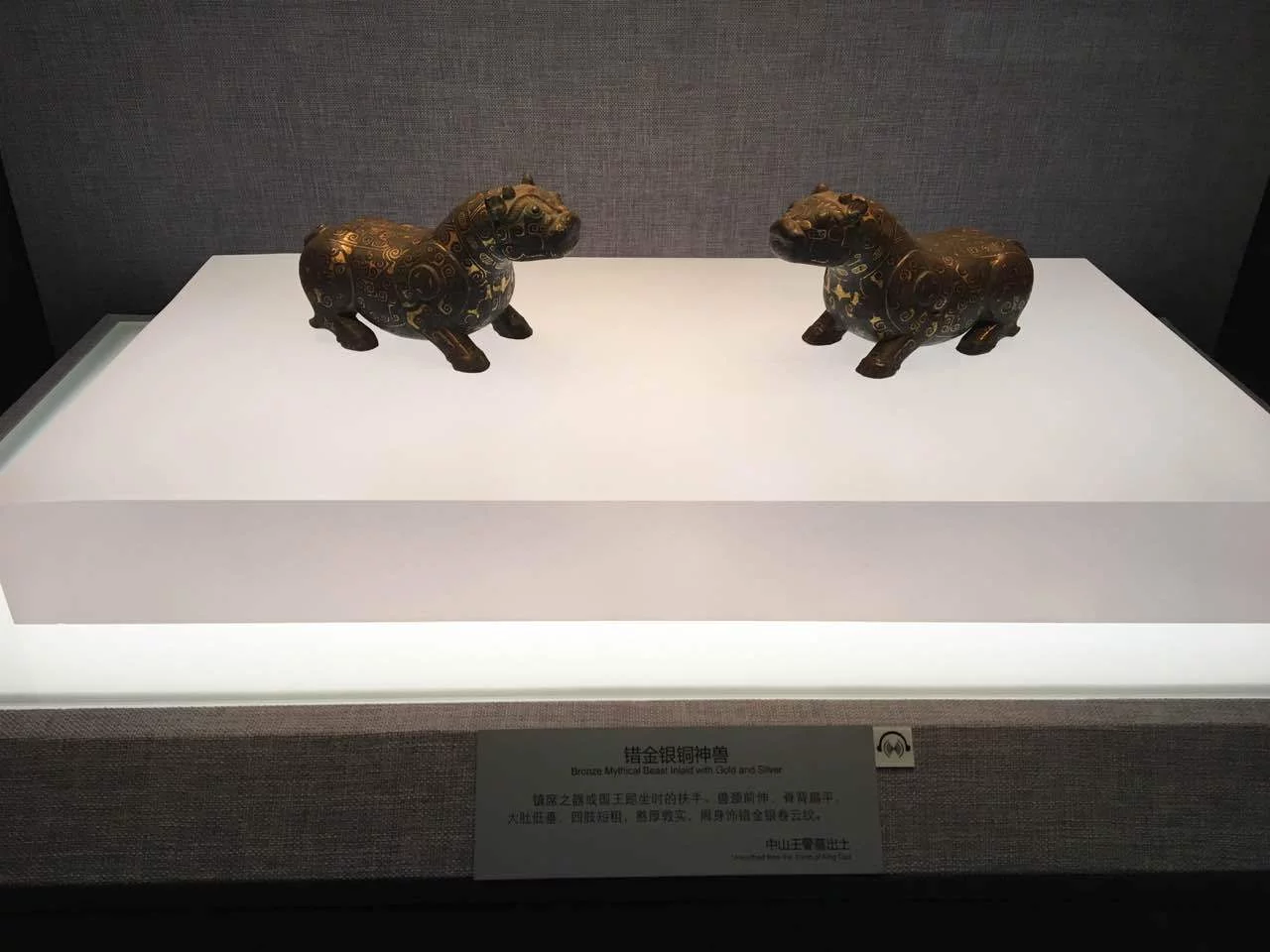这件错金银铜神兽,形状似牛非牛,有人说是貘,但又非全然相似。头似小牛,有一对短角,身体矮小,脊背扁平,大肚低垂,四肢粗短,偶蹄,短尾,体态笨拙,十分可爱。该器周身饰错金银漫卷云纹,以写实和装饰相结合,尤其对躯体的各个部分给予描画和渲染以突出轮廓,不仅使花纹富于变化,还增加了神兽的神秘感。错金银铜神兽共出一对两件,依出土情况原应置于屏风或几的附近,或作镇器以压席之边角,似乎经常受主人抚摩玩赏,器表摩擦十分明显,并且沾有黑色泥渍。