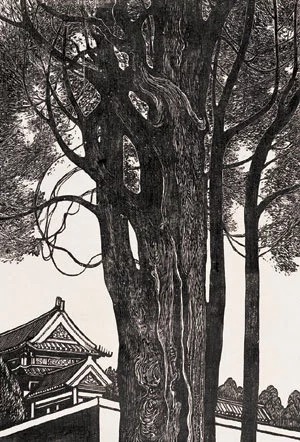 从艺术设计方面看,对比手法运用得十分巧妙。你看,参天的古柏,宏伟的官墙楼角,形成了一高一低,一巨一细的对比;树杆向上下伸展的曲线,同宫墙楼角的横斜直线的对比;黑白灰三色的穿插对比;树叶与树杆、建筑物的柔刚演水错对比;写实与装饰手法的对比。经过一连串的对比,画面便产生音乐节奏和诗的韵律,从而达到和谐统一的艺术效果,真是匠心独运,妙不可言。