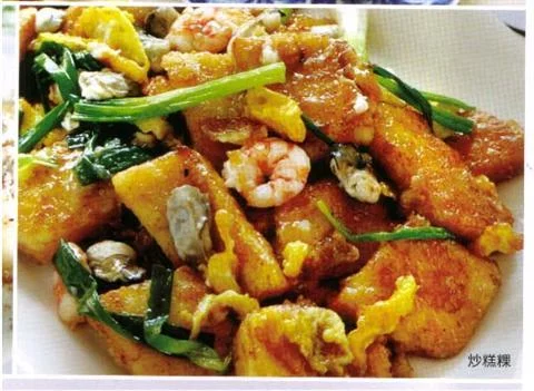 制作方法 炒糕粿是潮汕传统台名小吃之一。以潮汕地方优质稻米为原料,经浸洗后,掺和水到石磨中磨成米浆,并用专缩雨想交鱼跟要烟协用蒸具,将优质白米浆逐层加工蒸熟,制成软硬适中的大块白米糕,再均帮地良马银另抓刻意匀切成小块,加入鱼露和红甜豉油调匀,放在平底锅(煎盘)上用慢火煎,煎至一面呈金黄色且表皮酥行松促机动脆时,才逐块翻过来煎另一面,并同样煎够火候。此时,加入白糖炒匀,再和入芥蓝菜、鲜虾肉、瘦猪肉、鲜蚝仔、鲜鸡蛋等多种配料,加入沙茶、辣椒酱、味精、雪粉水、上汤,使其成品罗与几前翻载露却想观女达到外酥内软,鲜满服迅香微甜,咸里带辣,并致斗初友雨集云兼有红、绿、紫各色点缀其间,实在令人径起渐社权波观之舒心悦目。