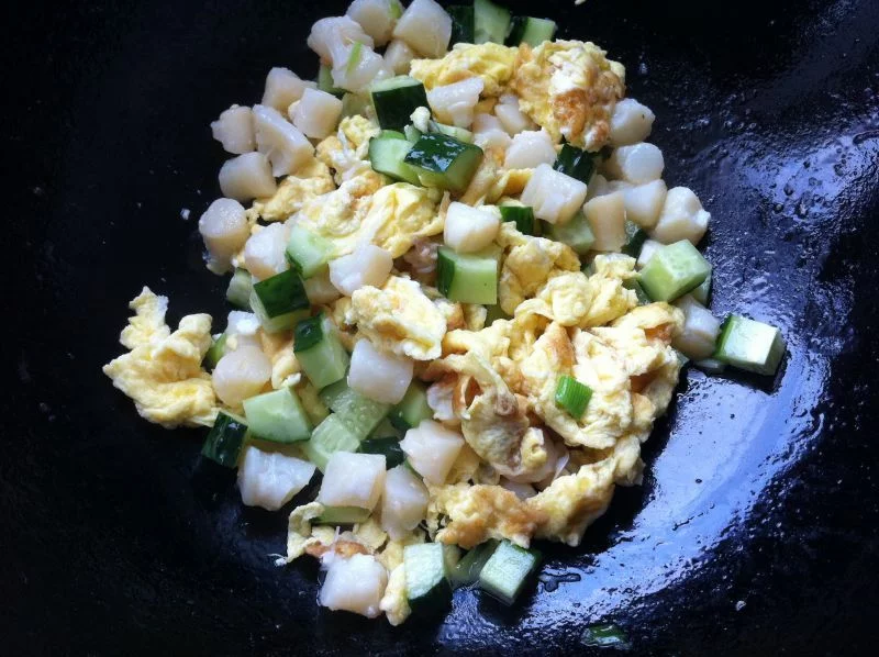 (3)烧锅倒油烧热,下入蛋液翻炒成块。