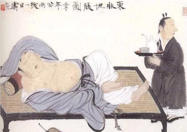 东晋时期,书法家王羲之年轻时很有才华来自,太尉郗鉴很器重他,想把女儿嫁给他,于是派人向王羲之伯父王导求亲。王导领来人到东厢房去看,只有王羲之独自敞着衣服,露着肚子躺在东床上吃东西。来人回去向郗鉴汇报说东床袒腹的就是王羲之。