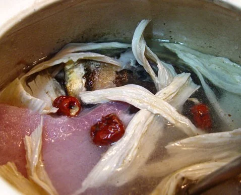 5、把花生、红枣、姜型片放入锅内,加清水适量,武火煮沸后,文火煲1小时,放入鱼头、支竹再煲1小时,调味供用。